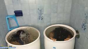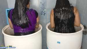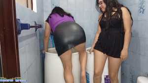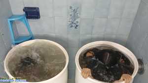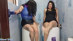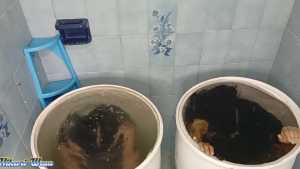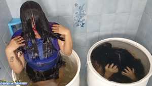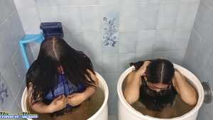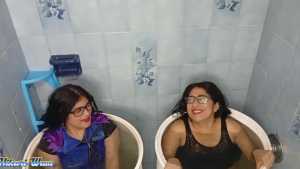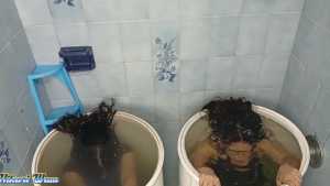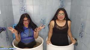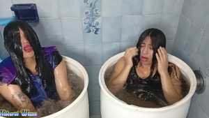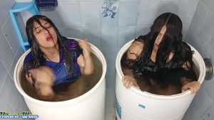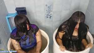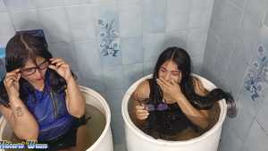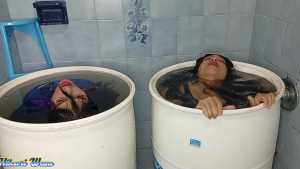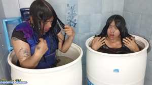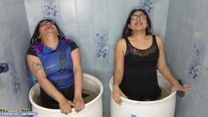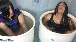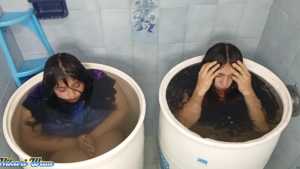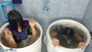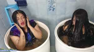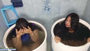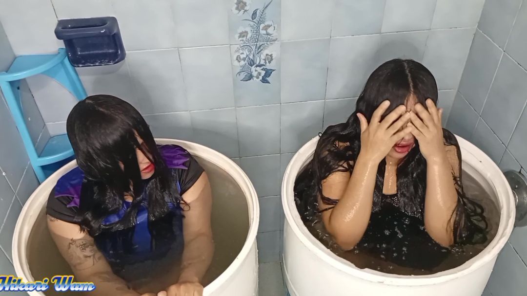 Hikari and Sofia, dressed as sexy secretaries, enjoy a wonderful moment together in the water buckets. Wearing miniskirts, low-cut tops, and eye-catching shoes, they play at diving and breathing underwater.
