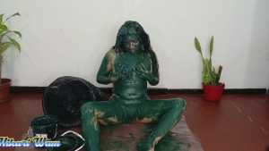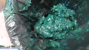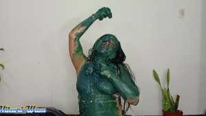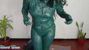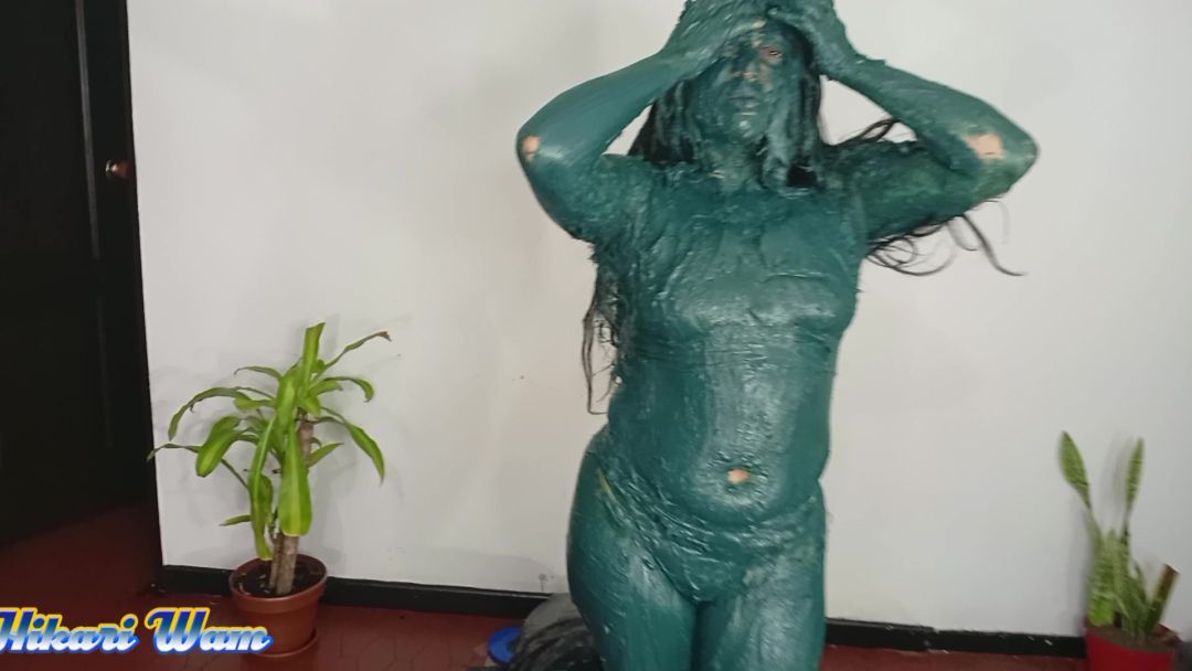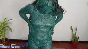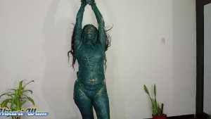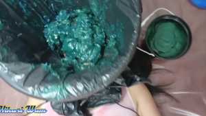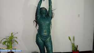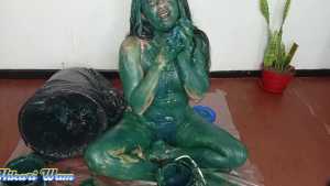 This has been the toughest challenge Sofia has ever accepted. They force her to put her head in a funnel-shaped bucket, where she's doused with a massive amount of motor grease--so much that it drips into her mouth and eyes and completely covers her face. She manages to climb out, her body covered from head to toe, leaving no part untouched. Her hair is a complete mess. Dressed in a sexy bikini, she's unrecognizable with all the grease on her body, hair, and face. What a disaster!