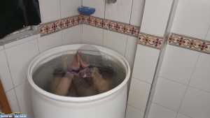 Interesting round tub bathing in nice clothing, love this kind of swimming, interesting to see the wet hair at the end... great to see...